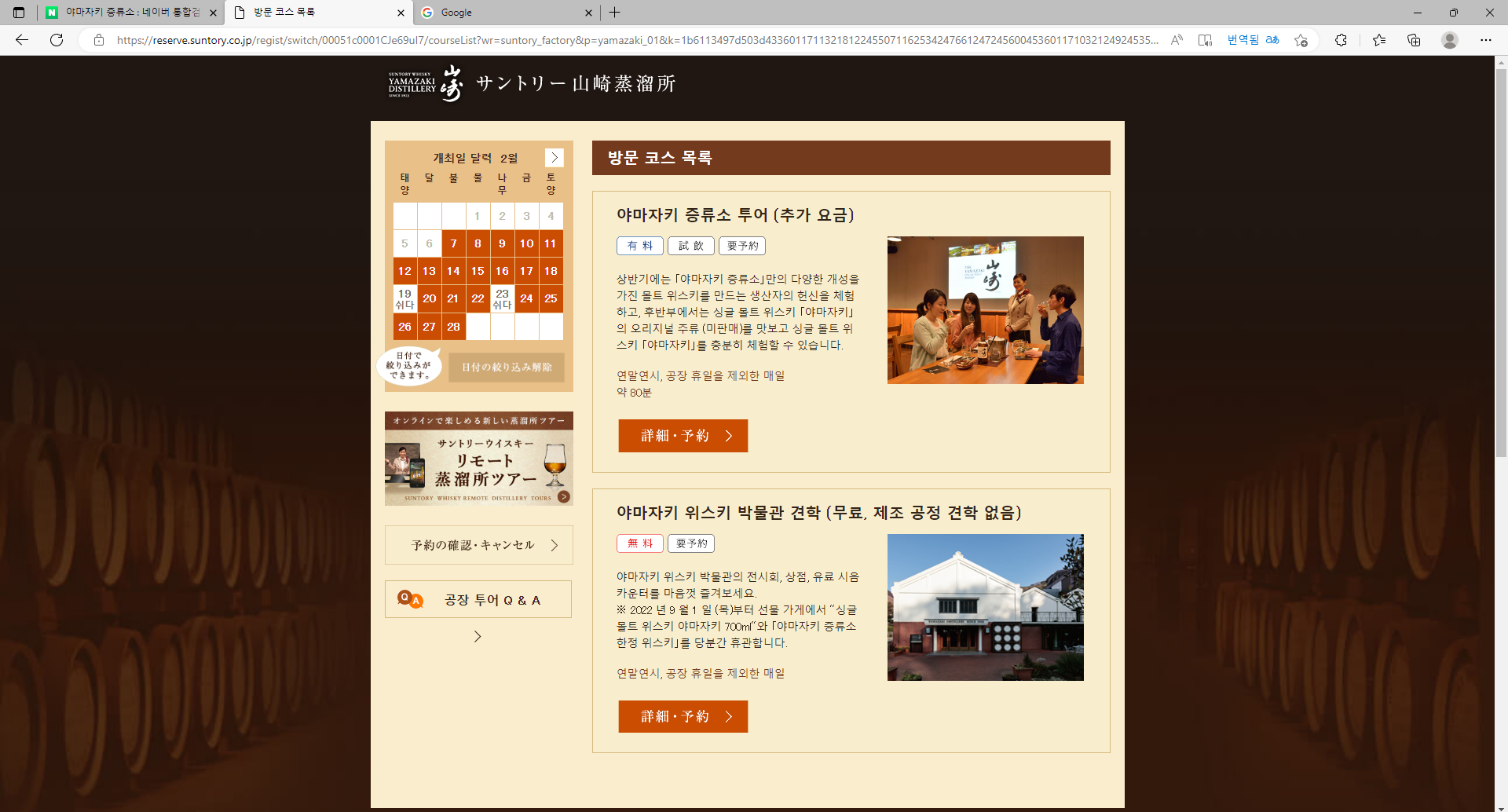 여기 링크가 야마자키 증류소 사이트로 예약 할수 있는 사이트입니다!